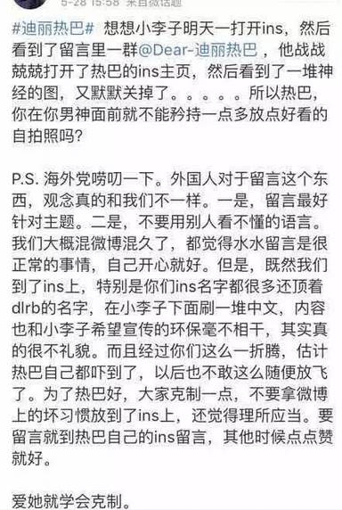 事情是这样的,大约5天前迪丽热巴在小李子的ins下留了一条言