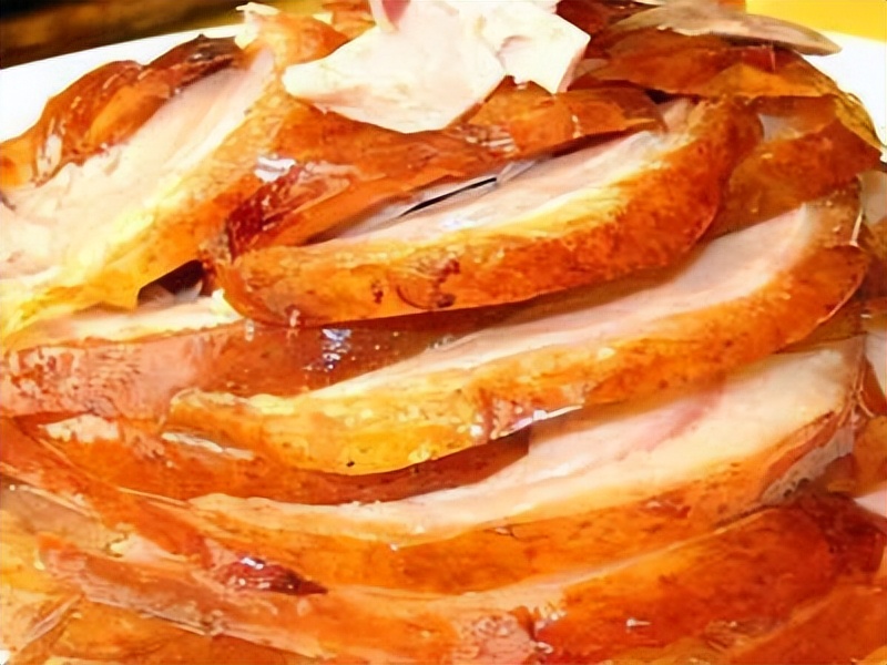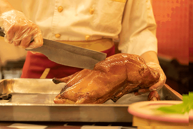 因为片得好不仅菜肴造型更佳,而且口味更美。烤鸭烤制成后,要在鸭脯凹塌前及时片下皮肉装盘供食。此时的鸭肉吃在嘴里酥香味美。片鸭的方法也有讲究,一是趁热先片下鸭皮吃,酥脆香美;然后再片鸭肉吃。二是片片有皮带肉,薄而不碎。一只2公斤重的鸭子,能片出100余片鸭肉片,而且大小均匀如丁香叶口感则酥香鲜嫩,独具风味。
