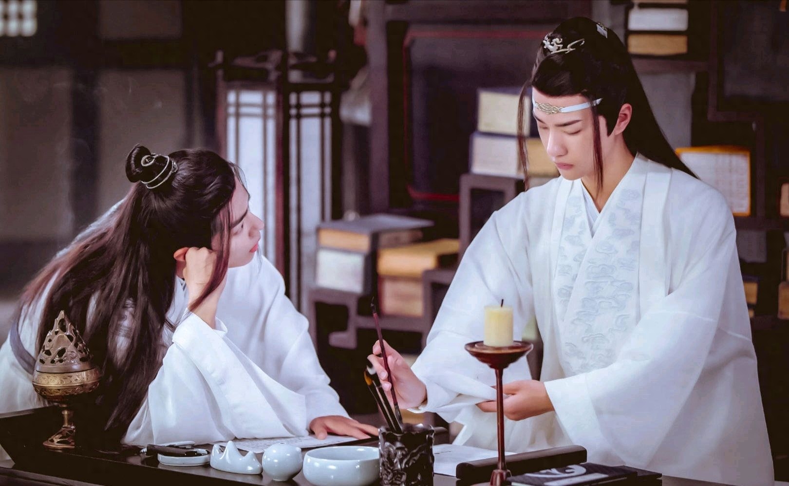 他修鬼道,损身损心性,蓝湛自知劝不动,便屡犯家规, 偷进禁室研习琴谱,为的就是帮助魏婴驱邪静心。