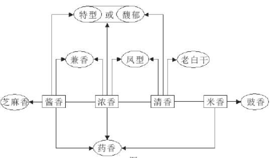 6.中国白酒各香型之间的关系。各香型的白酒之间是不是就相互独立没有联系呢,也不是,有篇文章对不同香型之间酒的关系总结的很到位,并做了张关系图(酿酒2007,34(3):106-111),如下: